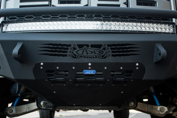 The  2017-18 Raptor 3.5L ADD HoneyBadger front bumper is one of our toughest bumpers yet. Made with 1/8" external steel plating and 3/16" internal structure plating. And removable 1/8" aluminum skid plate and accent panels. With an aggressive style the HoneyBadger front bumper for the 2017-2020 Raptor highlights the truck's look, while providing superior protection to your front end components. Reinforced clevis mounts made from 1" steel are designed to accommodate a 3/4" D-ring.
