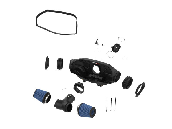 The dual air filters are surrounded by an open-element XLPE (cross-linked polyethylene) polymer housing that minimizes warm engine air for maximum performance. It is precisely designed and manufactured to fit perfectly into the factory mounting location. The housing connects to the factory air inlets on each side of the vehicle to capture the coolest air available. Silicone bellow couplings are used for engine movement and easy installation. All the factory harness and mounts are transferred to the back of the aFe POWER housing for a factory-like installation. The radio antenna plastic melded on the factory air box is also transferred to the aFe POWER housing. The removal of the antenna from the factory air box requires two plastic melted mounting tabs to be cut off.