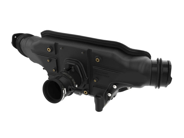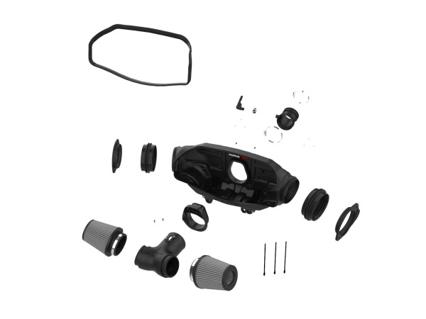 The dual air filters are surrounded by an open-element XLPE (cross-linked polyethylene) polymer housing that minimizes warm engine air for maximum performance. It is precisely designed and manufactured to fit perfectly into the factory mounting location. The housing connects to the factory air inlets on each side of the vehicle to capture the coolest air available.