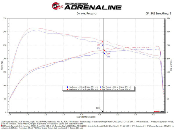 Momentum*s unique filter-to-housing interface was built to feature the largest air filter possible. This 8* tall 360-degree radial flow air filter features a 4" flange and our oil-free Pro DRY S media with three layers of synthetic media for maximum convenience. Its progressive layering provides great filtration efficiency and dust holding capacity, while not requiring the use of oils. This media is best suited for street use. Its inverted top makes for more filter surface area, resulting in longer service intervals, while reinforced metal provides maximum strength to prevent filter collapse. The smooth one-piece sealed housing, constructed of heat-resistant cross-linked polyethylene (XLPE), features our patent-pending filter-to-housing interface. Its innovative design minimizes the total number of parts, making for an easy installation. A clear sight window allows for hassle-free filter inspection, without having to disassemble your system. The housing connects to the factory air inlet duct but also captures air from the opening in the fender to provide more immediate cool air to the engine. This system features high quality, computer-designed, dyno-tuned intake tubes to achieve maximum power gains while maintaining a perfect fit. Their XLPE material is heat soak resistant and extremely durable. To maximize the amount of air going to this air intake system, aFe POWER D.A.S. 50-70119S is available and sold separately (Only Fits Toyota Tacoma). The Dynamic Air Scoop will replace the factory air inlet duct and provide more cold air to the air intake system directly from the front of the vehicle. Stainless-steel clamps and silicone coupler are included for strength and durability. Momentum GT intakes are designed with fewer parts for a fast and easy installation. Momentum GT Cold Air Intake System w/ Pro DRY S Filter Toyota Tacoma 24-25/4Runner 2025 L4-2.4L (t) Fitment: 2024 Toyota Tacoma Limited 2024 Toyota Tacoma SR 2024 Toyota Tacoma SR5 2024 Toyota Tacoma Trailhunter 2024 Toyota Tacoma TRD Off-Road 2024 Toyota Tacoma TRD PreRunner 2024 Toyota Tacoma TRD Pro 2024 Toyota Tacoma TRD Sport