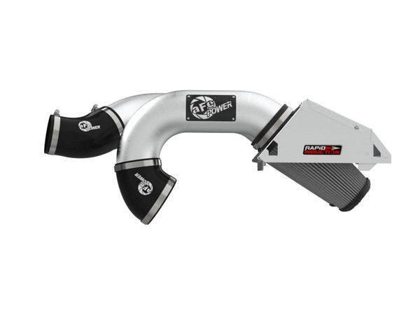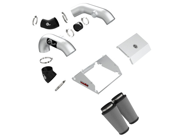 This intake system features dual 8” tall conical air filters with three layers of oil-free synthetic media and requires no oil during maintenance to provide maximum convenience. Its progressive layering provides great filtration efficiency and dust holding capacity. This media is best suited for street and light off-road use. Pro DRY S filters are easily recharged with aFe's POWER CLEANER. Dual one-piece 3-1/2" mandrel-bent brushed aluminum intake tubes direct unrestricted airflow from the massive filters to the turbos for more horsepower and torque. aFe developed this lightweight aluminum brushed heat shield to snap onto the top of the lower half of the factory airbox to provide a hassle-free installation utilizing factory mounting locations. A brushed aluminum cover is used to finish off this intake and add a sense of style to your engine bay. Premium hardware and clamps are used to securely mount the high flow air filters and the intake tubes. Rapid Induction Cold Air Intake System w/ Pro DRY S Filter Brushed.