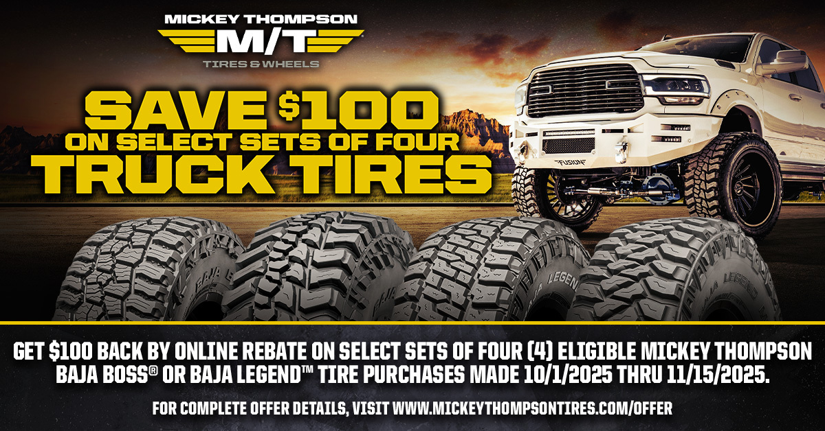 From October 1 through November 15, 2025, customers who purchase a set of four (4) eligible Mickey Thompson tires can receive a $100 rebate. This rebate covers some of Mickey Thompson’s most popular tire families, including the Baja Boss A/T, Baja Boss M/T, Baja Legend EXP, and Baja Legend MTZ.