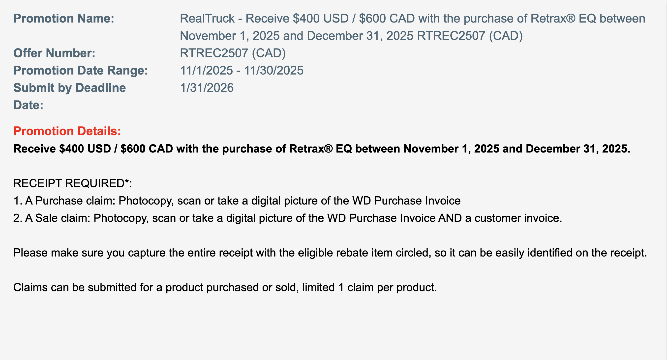 Upgrade your truck before December 31, 2025, to take advantage of the Retrax EQ $400 rebate — and make this Black Friday / Cyber Monday season the one where your truck gets the upgrade it deserves.