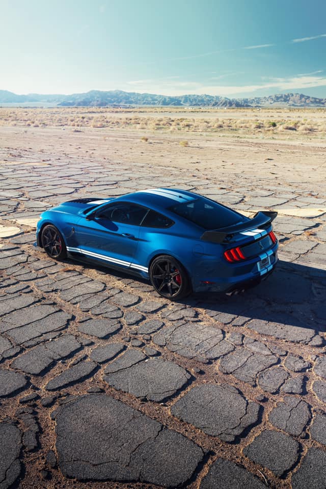 Under the GT500-only bulge hood will be a supercharged 5.2-liter V8. It's the same aluminum block as is in the GT350. But instead of going with the exotic flat-plane crank, the GT500 will be a more traditional muscle-car setup with a crossplane crank. The entire rotating assembly has been beefed up to handle more horsepower.