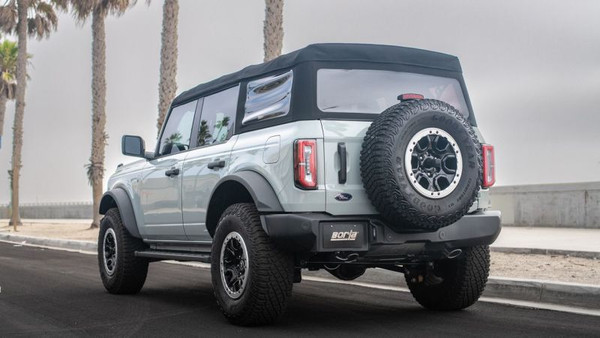 The BORLA(r) team has created a system especially for the 2.7L Ford Bronco. This Cat-Back(tm) exhaust system is engineered for performance and has our mild "Touring" sound no drone. This exhaust system features a 2.5" inlet that flows into a 2.75" pipe and exits via dual 2.5" diameter tailpipes with 4" polished T-304 stainless steel exhaust tips. Our custom muffler hanger design moves the hanger out of sight for a clean appearance. T-304 stainless steel construction provides additional durability over the stock exhaust. Ultra-smooth mandrel bends ensure maximum flow & power, and precision computer numerical control (CNC) manufacturing ensures an accurate fit. Give your Bronco a boost in performance and sound, bolt on a BORLA(r). All BORLA(r) Cat-Back(tm) and Axle-Back systems are made in the USA and are covered by our Million-Mile warranty. , System Features: , Cat-Back(tm) Exhaust System, Touring Sound Level, 2.5" Inlet Flows Into 2.75" Muffler Inlet & Dual 2.5" Tailpipes, No-Drone, 4" Polished T-304 Stainless Steel Tips, Million Mile Warranty Touring Axle-Back Exhaust System 2021-2022 Ford Bronco 2.7L V6 Automatic Transmission 4 Wheel Drive 2 & 4 Door.