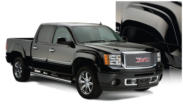 Give your GMC Sierra the appearance of an upmarket trim level with Bushwacker OE Style(R) Fender Flares. They install in minutes with no drilling. And, they're designed specifically to complement your vehicles styling, so it looks like it came from the factory that way, with a fit, finish, and level of protection that exceeds original equipment. You can leave your OE Style(R) Fender Flares with their original matte black finish for a sporty, blackout look. Or, paint them to match or accent the body color for the look of limited-edition luxury or something completely customized . Your OE Style(R) Fender Flares are made with Dura-Flex(R) 2000, our exclusive material designed for upgraded durability and flexibility. They're thick too, so they wont warp. And, they're 100% UV protected, so they wont chalk. OE Style(R) Fender Flares deliver premium-grade protection with premium-level style. BUSHWACKER - FENDER FLARES BW 2010-2013 GMC Sierra 1500 SL Fleetside 78.9 Bed; 2010-2013 GMC Sierra 1500 SL Fleetside 97.8 Bed; 2007-2009 GMC Sierra 1500 SLE Fleetside 78.7 Bed; 2010-2013 GMC Sierra 1500 SLE Fleetside 78.9 Bed; 2007-2009 GMC Sierra 1500 SLE Fleetside 97.6 Bed; 2010-2013 GMC Sierra 1500 SLE Fleetside 97.8 Bed; 2007-2009 GMC Sierra 1500 SLT Fleetside 78.7 Bed; 2010-2013 GMC Sierra 1500 SLT Fleetside 78.9 Bed; 2007-2009 GMC Sierra 1500 SLT Fleetside 97.6 Bed; 2010-2013 GMC Sierra 1500 SLT Fleetside 97.8 Bed; 2007-2009 GMC Sierra 1500 WT Fleetside 78.7 Bed; 2010-2013 GMC Sierra 1500 WT Fleetside 78.9 Bed; 2007-2009 GMC Sierra 1500 WT Fleetside 97.6 Bed; 2010-2013 GMC Sierra 1500 WT Fleetside 97.8 Bed; 2007-2014 GMC Sierra 2500 HD Fleetside; 2007-2013 GMC Sierra 2500 HD Fleetside 78.8 Bed; 2007-2013 GMC Sierra 2500 HD Fleetside 97.6 Bed; 2013 GMC Sierra 2500 HD SLE Fleetside 78.8 Bed; 2013 GMC Sierra 2500 HD SLE Fleetside 97.6 Bed; 2013 GMC Sierra 2500 HD SLT Fleetside 78.8 Bed; 2013 GMC Sierra 2500 HD SLT Fleetside 97.6 Bed; 2013 GMC Sierra 2500 HD WT Fleetside 97.6 Bed; 2007-2014 GMC Sierra 3500 HD Fleetside; 2013 GMC Sierra 3500 HD Fleetside 78.8 Bed; 2007-2013 GMC Sierra 3500 HD Fleetside 97.6 Bed; 2007-2008 GMC Sierra 3500 HD SLE Fleetside 97.6 Bed; 2011-2012 GMC Sierra 3500 HD SLE Fleetside 97.6 Bed; 2007-2008 GMC Sierra 3500 HD SLT Fleetside 97.6 Bed; 2011-2012 GMC Sierra 3500 HD SLT Fleetside 97.6 Bed; 2007-2008 GMC Sierra 3500 HD WT Fleetside 97.6 Bed; 2011-2012 GMC Sierra 3500 HD WT Fleetside 97.6 Bed Fitment: 2007GMCSierra 1500SLE 2007GMCSierra 1500SLT 2007GMCSierra 1500WT 2007GMCSierra 2500 HDSLE 2007GMCSierra 2500 HDSLT 2007GMCSierra 2500 HDWT 2007GMCSierra 3500 HDSLE 2007GMCSierra 3500 HDSLT 2007GMCSierra 3500 HDWT 2008GMCSierra 1500SLE 2008GMCSierra 1500SLT 2008GMCSierra 1500WT 2008GMCSierra 2500 HDSLE 2008GMCSierra 2500 HDSLT 2008GMCSierra 2500 HDWT 2008GMCSierra 3500 HDSLE 2008GMCSierra 3500 HDSLT 2008GMCSierra 3500 HDWT 2009GMCSierra 1500SLE 2009GMCSierra 1500SLT 2009GMCSierra 1500WT 2009GMCSierra 2500 HDSLE 2009GMCSierra 2500 HDSLT 2009GMCSierra 2500 HDWT 2009GMCSierra 3500 HDSLE 2009GMCSierra 3500 HDSLT 2009GMCSierra 3500 HDWT 2010GMCSierra 1500SL 2010GMCSierra 1500SLE 2010GMCSierra 1500SLT 2010GMCSierra 1500WT 2010GMCSierra 2500 HDSLE 2010GMCSierra 2500 HDSLT 2010GMCSierra 2500 HDWT 2010GMCSierra 3500 HDSLE 2010GMCSierra 3500 HDSLT 2010GMCSierra 3500 HDWT 2011GMCSierra 1500SL 2011GMCSierra 1500SLE 2011GMCSierra 1500SLT 2011GMCSierra 1500WT 2011GMCSierra 2500 HDDenali 2011GMCSierra 2500 HDSLE 2011GMCSierra 2500 HDSLT 2011GMCSierra 2500 HDWT 2011GMCSierra 3500 HDSLE 2011GMCSierra 3500 HDSLT 2011GMCSierra 3500 HDWT 2012GMCSierra 1500SL 2012GMCSierra 1500SLE 2012GMCSierra 1500SLT 2012GMCSierra 1500WT 2012GMCSierra 2500 HDDenali 2012GMCSierra 2500 HDSLE 2012GMCSierra 2500 HDSLT 2012GMCSierra 2500 HDWT 2012GMCSierra 3500 HDSLE 2012GMCSierra 3500 HDSLT 2012GMCSierra 3500 HDWT 2013GMCSierra 1500SL 2013GMCSierra 1500SLE 2013GMCSierra 1500SLT 2013GMCSierra 1500WT 2013GMCSierra 2500 HDSLE 2013GMCSierra 2500 HDSLT 2013GMCSierra 2500 HDWT 2013GMCSierra 3500 HDDenali 2013GMCSierra 3500 HDSLE 2013GMCSierra 3500 HDSLT 2013GMCSierra 3500 HDWT 2014GMCSierra 2500 HDDenali 2014GMCSierra 2500 HDSLE 2014GMCSierra 2500 HDSLT 2014GMCSierra 2500 HDWT 2014GMCSierra 3500 HDDenali 2014GMCSierra 3500 HDSLE 2014GMCSierra 3500 HDSLT 2014GMCSierra 3500 HDWT