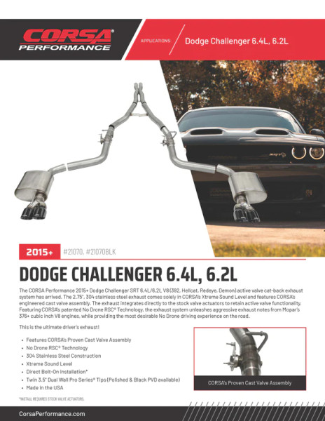 he CORSA Performance 2015-2023 Dodge Challenger SRT 6.4L/6.2L V8 (392, Hellcat, Redeye, Demon) active valve cat-back exhaust system has arrived. The 2.75”, 304 stainless steel exhaust comes solely in CORSA’s Xtreme Sound Level and features CORSA’s engineered cast valve assembly. The exhaust integrates directly to the stock valve actuators to retain active valve functionality.