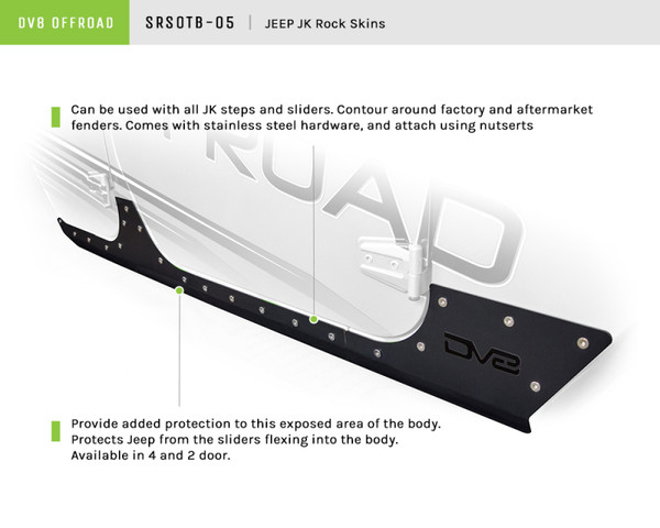 DV8 Off Road Rock Skins provide added protection to the rocker panels of the body comes with both driver side and passenger side rock skin and all mounting hardware. Jeep JK Rock Skins 07-18 Wrangler JK Steel DV8 Offroad 2007 thru 2018 Jeep Wrangler JK Fitment: 2007 Jeep Wrangler Rubicon 2007 Jeep Wrangler Sahara 2007 Jeep Wrangler Unlimited Rubicon 2007 Jeep Wrangler Unlimited Sahara 2007 Jeep Wrangler Unlimited X 2007 Jeep Wrangler X 2008 Jeep Wrangler Rubicon 2008 Jeep Wrangler Sahara 2008 Jeep Wrangler Unlimited Rubicon 2008 Jeep Wrangler Unlimited Sahara 2008 Jeep Wrangler Unlimited X 2008 Jeep Wrangler X 2009 Jeep Wrangler Rubicon 2009 Jeep Wrangler Sahara 2009 Jeep Wrangler Unlimited Rubicon 2009 Jeep Wrangler Unlimited Sahara 2009 Jeep Wrangler Unlimited X 2009 Jeep Wrangler X 2010 Jeep Wrangler Rubicon 2010 Jeep Wrangler Sahara 2010 Jeep Wrangler Sport 2010 Jeep Wrangler Unlimited Rubicon 2010 Jeep Wrangler Unlimited Sahara 2010 Jeep Wrangler Unlimited Sport 2010 Jeep Wrangler Unlimited X 2010 Jeep Wrangler X 2011 Jeep Wrangler 70th Anniversary 2011 Jeep Wrangler Rubicon 2011 Jeep Wrangler Sahara 2011 Jeep Wrangler Sport 2011 Jeep Wrangler Unlimited 70th Anniversary 2011 Jeep Wrangler Unlimited Rubicon 2011 Jeep Wrangler Unlimited Sahara 2011 Jeep Wrangler Unlimited Sport 2012 Jeep Wrangler Rubicon 2012 Jeep Wrangler Sahara 2012 Jeep Wrangler Sport 2012 Jeep Wrangler Unlimited Rubicon 2012 Jeep Wrangler Unlimited Sahara 2012 Jeep Wrangler Unlimited Sport 2013 Jeep Wrangler Rubicon 2013 Jeep Wrangler Sahara 2013 Jeep Wrangler Sport 2013 Jeep Wrangler Unlimited Rubicon 2013 Jeep Wrangler Unlimited Sahara 2013 Jeep Wrangler Unlimited Sport 2014 Jeep Wrangler Rubicon 2014 Jeep Wrangler Sahara 2014 Jeep Wrangler Sport 2014 Jeep Wrangler Unlimited Rubicon 2014 Jeep Wrangler Unlimited Sahara 2014 Jeep Wrangler Unlimited Sport 2015 Jeep Wrangler Rubicon 2015 Jeep Wrangler Sahara 2015 Jeep Wrangler Sport 2015 Jeep Wrangler Unlimited Rubicon 2015 Jeep Wrangler Unlimited Sahara 2015 Jeep Wrangler Unlimited Sport 2016 Jeep Wrangler 75th Anniversary 2016 Jeep Wrangler Rubicon 2016 Jeep Wrangler Sahara 2016 Jeep Wrangler Sport 2016 Jeep Wrangler Sport S 2016 Jeep Wrangler Unlimited 75th Anniversary 2016 Jeep Wrangler Unlimited Rubicon 2016 Jeep Wrangler Unlimited Sahara 2016 Jeep Wrangler Unlimited Sport 2016 Jeep Wrangler Unlimited Sport S 2017 Jeep Wrangler Rubicon 2017 Jeep Wrangler Sahara 2017 Jeep Wrangler Sport 2017 Jeep Wrangler Unlimited Rubicon 2017 Jeep Wrangler Unlimited Sahara 2017 Jeep Wrangler Unlimited Sport 2018 Jeep Wrangler JK Rubicon 2018 Jeep Wrangler JK Sahara 2018 Jeep Wrangler JK Sport 2018 Jeep Wrangler JK Sport S 2018 Jeep Wrangler JK Unlimited Rubicon 2018 Jeep Wrangler JK Unlimited Sahara 2018 Jeep Wrangler JK Unlimited Sport 2018 Jeep Wrangler JK Unlimited Sport S