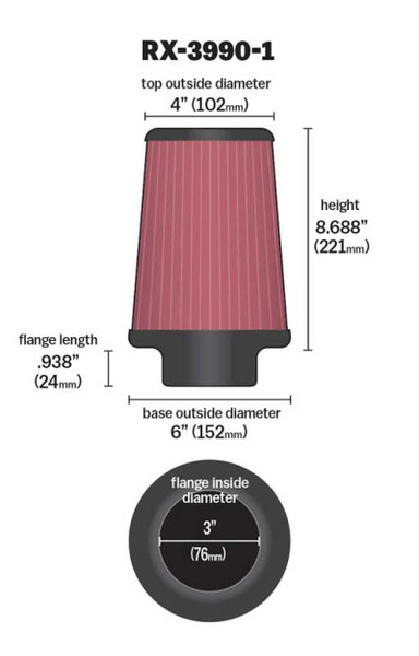 K&N Filter Universal X Stream Clamp-On 4in Top OD x 6in Base OD x 8.688in H x 3in Flange ID