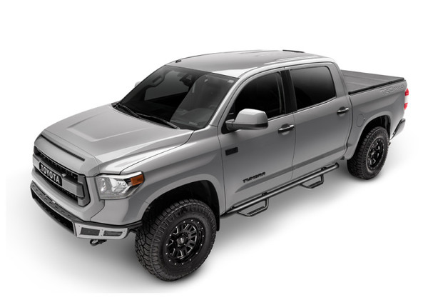 One of N-FAB's most popular styles is the Wheel to Wheel Nerf-Step. Utilizing N-FAB's patented hoop step design and innovative mounting system, N-FAB Wheel to Wheel Nerf Steps work on vehicles with and without body lift kits, with no modifications to brackets or bars. All N-FAB Wheel to Wheel Nerf Steps are built using .084 wall steel tubing and offer an industry high load rating of 465 pounds. All N-FAB Wheel to Wheel Nerf Steps are constructed as one-piece assemblies to provide maximum strength and durability not found in modular designs. Wheel to Wheel Nerf-Steps are designed and built specifically for each application, and mount high and tight to the vehicle cab for a clean factory look. Nerf Step Bar - Wheel-to-Wheel without Bed Access (2 Steps per Side) - 3 in. Main Tube Diameter - 2022-2024 Toyota Tundra 5' 6 Bed CrewMax - Textured Black - Special Order 2022-2024 Toyota Tundra CrewMax Cab Pickup 66.7 Bed