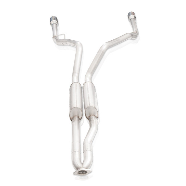 This system features dual mufflers and dual 5" polished slash-cut double wall tips. Designed to fit to the factory & performance connection points. Exits out at factory location under the bumper.