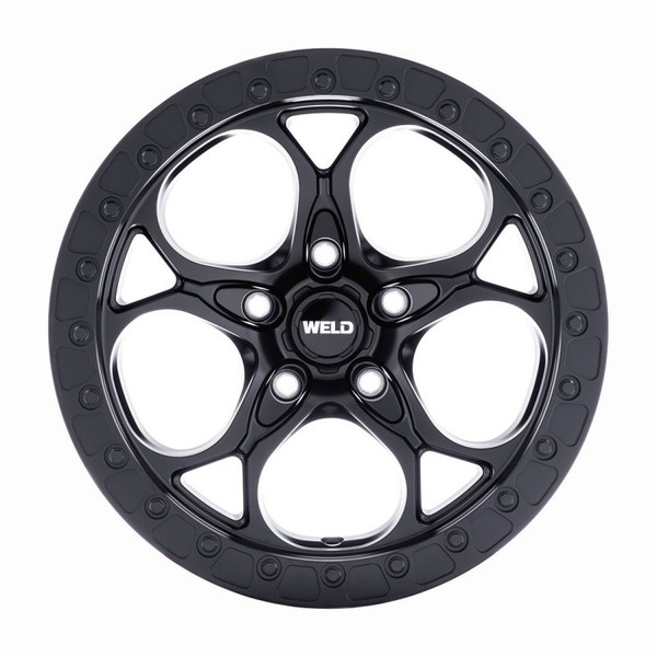 The Ledge W108 features the same look of the popular Ledge Beadlock wheel, but features a simulated beadlock ring for street use. Its rotary-formed construction results in an enviable combination of increased strength and reduced weight for performance both on and Off-Road Wheel. The Ledge W108 features an aggressively curved split five-spoke design currently offered in 17-inch sizes with a 5-lug Jeep bolt pattern. We finish it in smooth satin black with a satin black, street-legal, simulated beadlock ring . Its center cap is gloss black with a chrome WELD logo that stands out even behind dirt and mud.