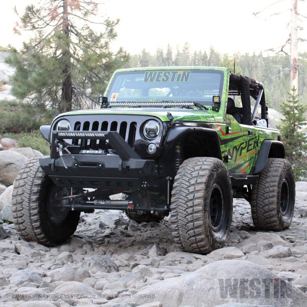 Westins WJ2 Stubby Bumper is constructed with 3/16-inch plate steel and features a stout LED light bar mount that accommodates a 20 single row light bar. The bumpers light bar mount includes ribs to protect your lights as well as adjustable brackets that allow you to mount Westin or competitor light bars. Our WJ2 Stubby Bumper improves ground and tire clearance while offering corner light mount points and rock light mount points, plus 2 side and 2 front off-road jack points. Your winch fits down inside the bumper to allow maximum air flow to your vehicles radiator and the WJ2 Stubby Bumper includes pre-drilled holes to allow installation of a winch while the bumper is already installed on your Jeep – most other brands wont! Product features recovery hooks with a recovery shackle mounting point to allow easy tow strap attachment. Bolt-on installation so no drilling is required. Recommended optional skid plate and light bars sold separately. Includes bumper, mounting hardware and install instructions. WJ2 Stubby Front Bumper w/LED Light Bar Mount; Steel; Textured Black; Incl. Mounting Bracket; Hardware And Install Sheet; Wrangler JK 2007-2018