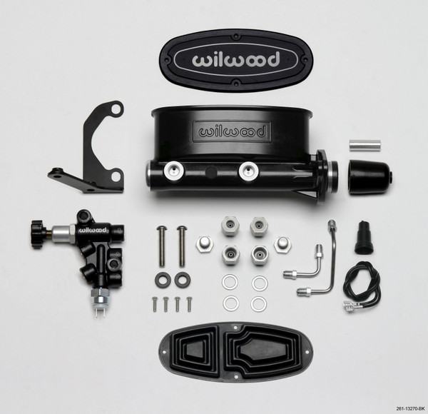 Wilwood has packaged the popular Aluminum Tandem Chamber Master Cylinder with the Combination Proportioning Valve, mounting bracket, fluid tubes and mounting hardware in a kit. Tandem Master Cylinder represents the latest in refinements in brake pressure actuation and fluid control. The slotted flange mounting makes it a simple bolt on for many OE mounts including the popular Chrysler, Corvette, GM, and Ford Mustang bolt patterns and is compatible with manual or power brake system applications. Master cylinders are available in four bores sizes, 7/8*, 15/16", 1.00* or 1-1/8*, and three finishes, standard, ball burnished or black E-coat. The combination proportioning valve substantially simplifies wiring and brake proportioning adjustments on vehicles with custom brake systems. The combination block maintains full isolation between front and rear fluid circuits and is specifically designed to accompany the Tandem Chamber Master Cylinder. The combo valve and bracket are black E-coated for a performance look and long lasting durability. Stainless steel fluid tubes are precision bent with preinstalled plated steel tube nuts for a simple bolt-on installation between the Combination Proportioning Valve and the Wilwood Tandem Master Cylinder. Stainless steel button head fasteners thread into the bracket for a simple installation and years of durable, rust-free performance. Simply connect the fluid lines, bleed the system, and you're finished.